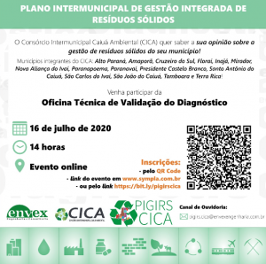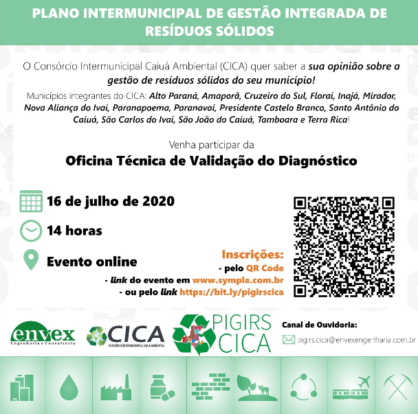 Plano Intermunicipal de Gestão Integrada de Resíduos Sólidos do Consórcio Intermunicipal Caiuá Ambiental (PIGIRS/CICA) é uma importante ferramenta de gestão de resíduos sólidos, e para construir um Plano de acordo com a realidade local, te convidamos a participar da Oficina Técnica de Validação do Diagnóstico!