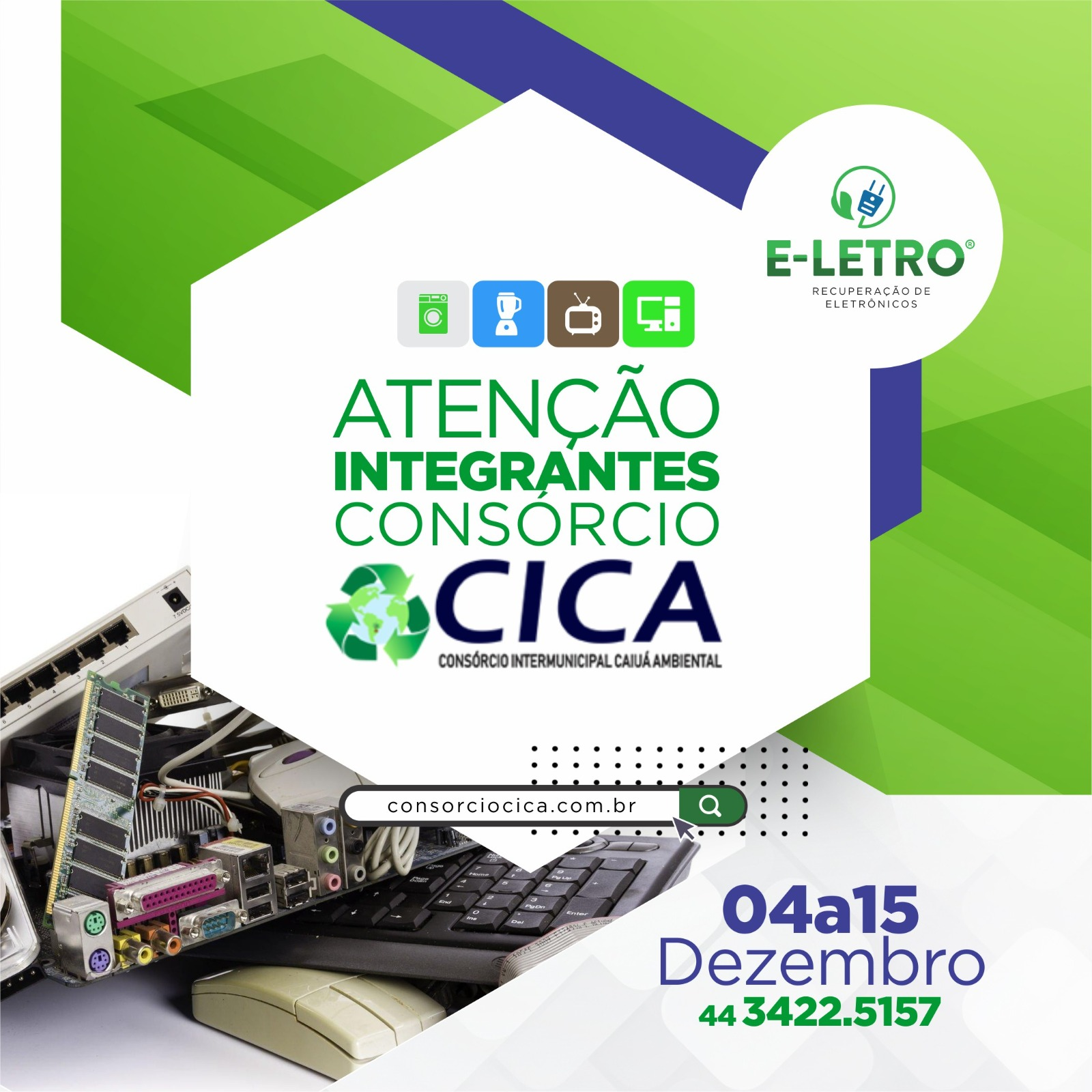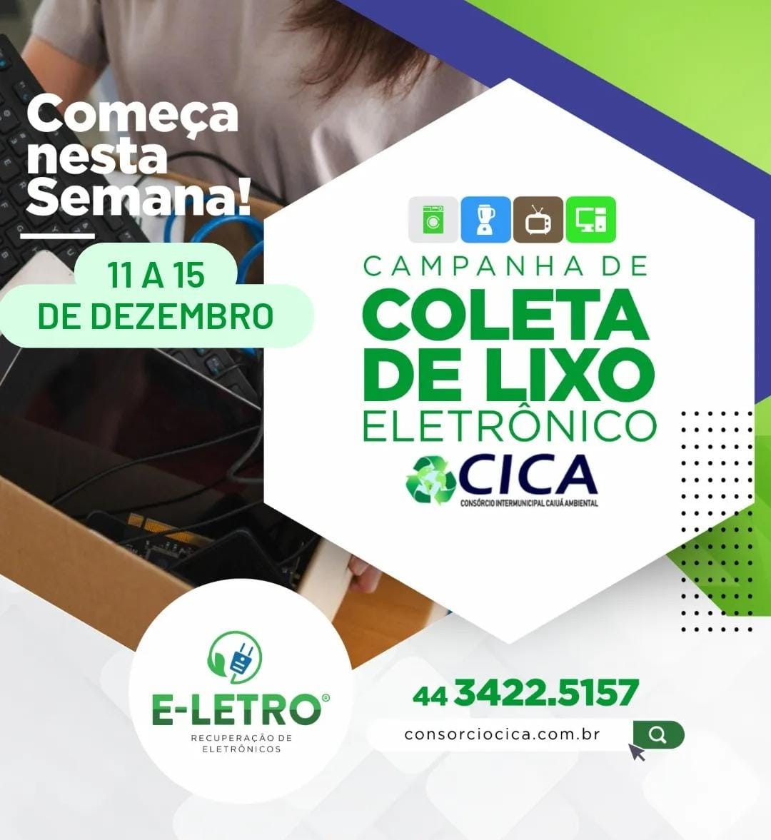 Na semana do dia 11 a 15 de Dezembro de 2023, o Consórcio Intermunicipal Caiuá Ambienta - CICA, em parceria com a ONG E- eletro @ong.eletro estará realizado a "Semana da Coleta de Lixo Eletrônico". Campanha atenderá os entes consórciados. Procure a Secretária do seu município e confira a programação: